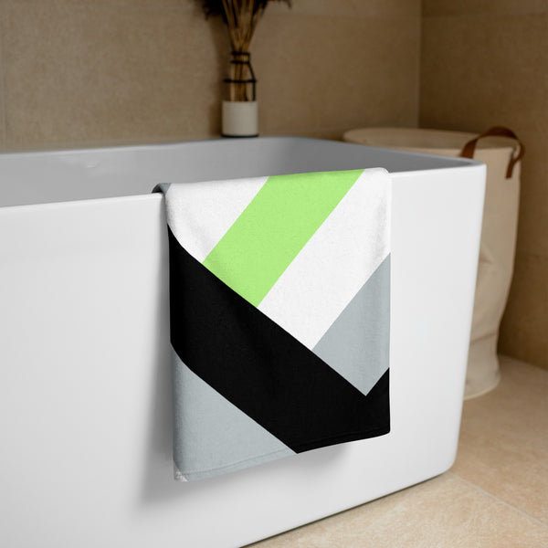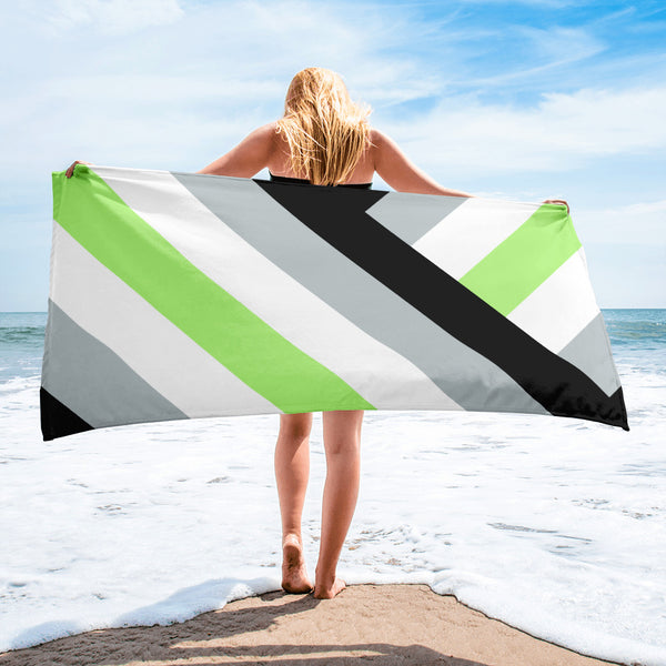 Wrap yourself in pride with our Agender Flag Beach Towel! Made with diagonal stripes in the iconic agender flag colors, it's the perfect way to show off your identity at the beach or pool. Soft and absorbent, this towel is both a fashion statement and a functional accessory.