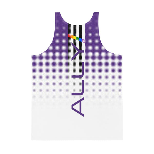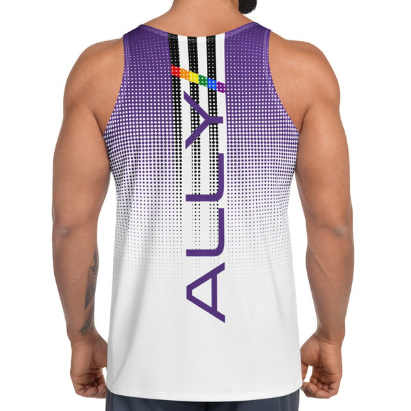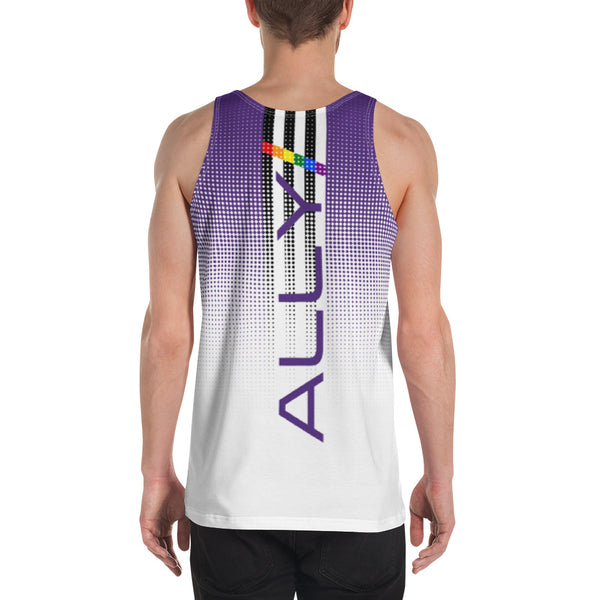 Bring on the pride with the Ally Tank Top! This vibrant top features a purple to white dotted fade, perfectly complementing the bold LGBTQ+ ally pride flag on the back. Show off your support and stand out in style.