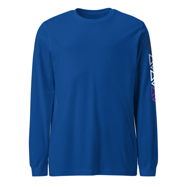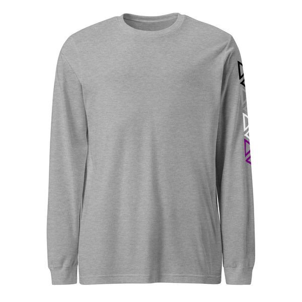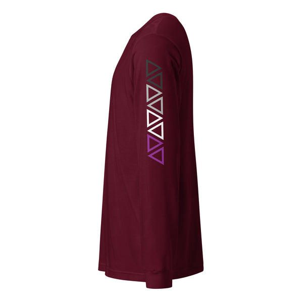 Show off your pride with our Asexual Pride Colors Long Sleeve T-Shirt! This stylish Unisex shirt features vibrant asexual flag colored triangles on the left sleeve, representing unity and inclusivity. Embrace your identity and showcase it with this empowering and unique design.