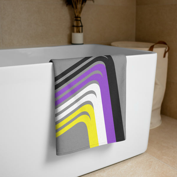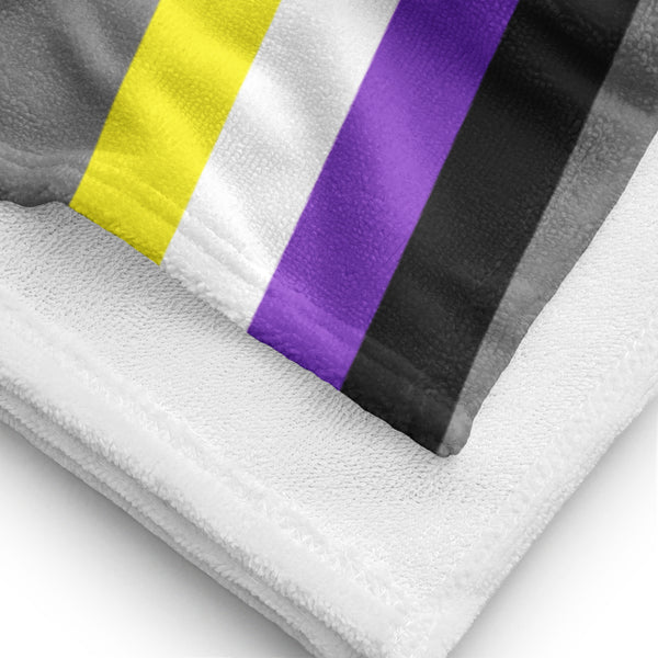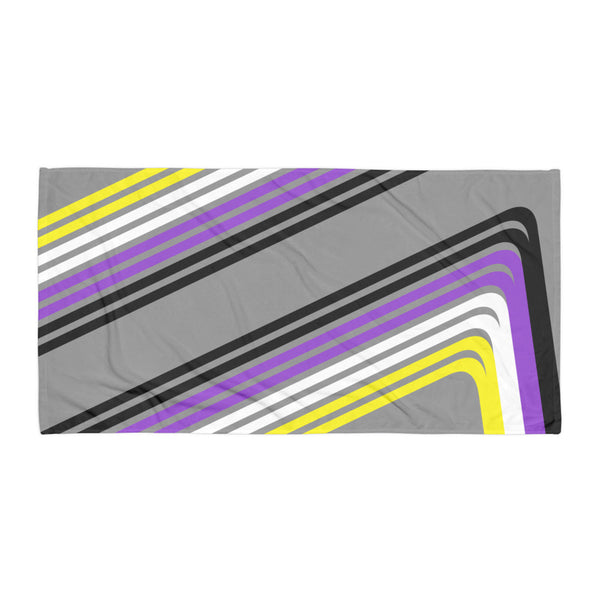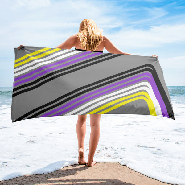 Wrap yourself in pride with our Non-binary Pride Colors Beach Towel. The vibrant non-binary flag colored stripes will make a statement at the beach or pool, while the soft and absorbent gray towel will keep you dry and comfortable. Show your support and celebrate diversity with this must-have accessory.