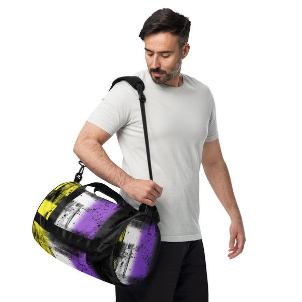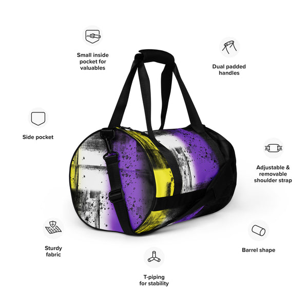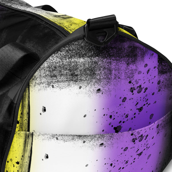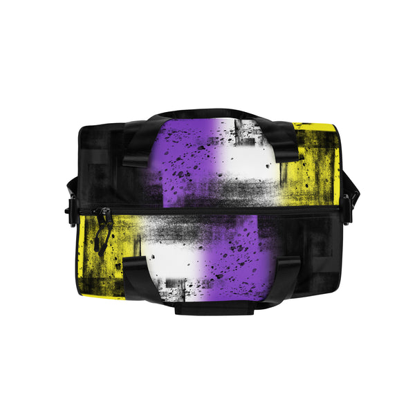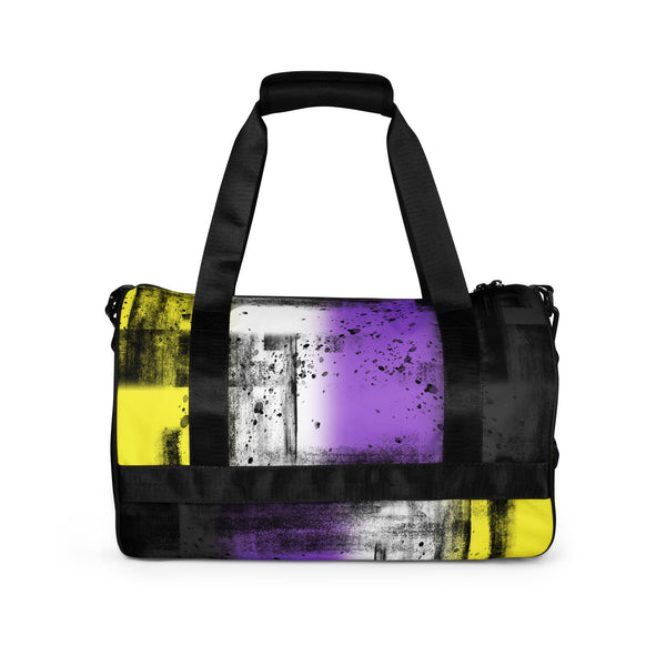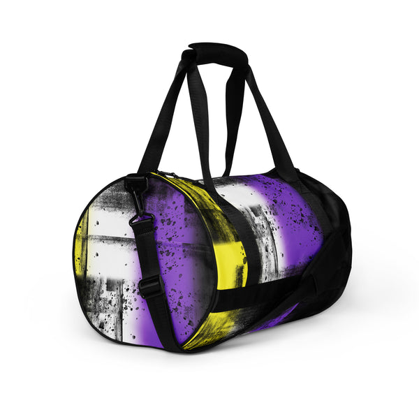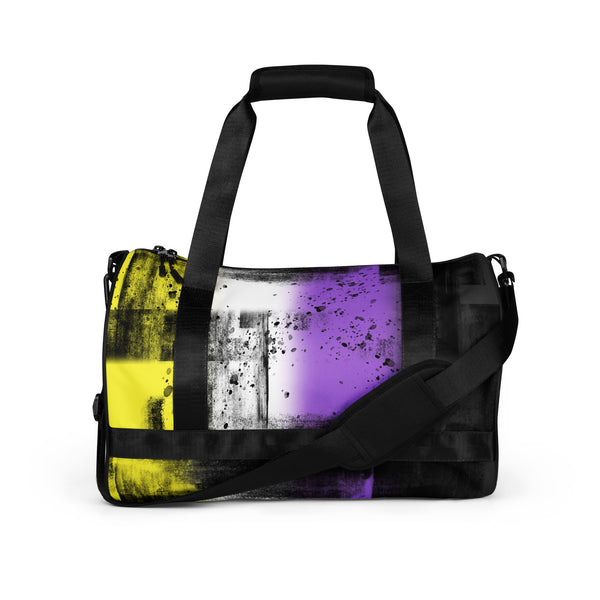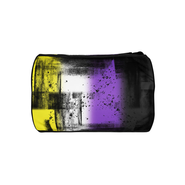 Carry your gym gear with pride in our Non-Binary Pride Colors Gym Bag. This bag boasts the colors of the non-binary pride flag along with black streaks for added style. Perfect for showing off your identity and hauling your workout essentials.