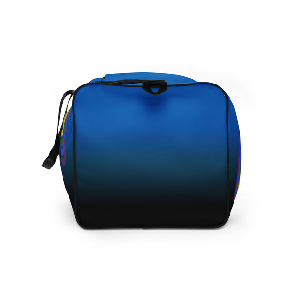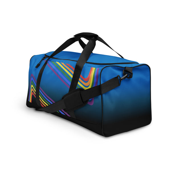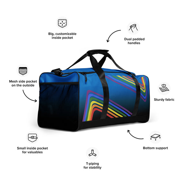Show your pride with our Rainbow Pride Duffle Bag! The vibrant blue to black fade makes a bold statement, while the arched gay rainbow pride flags showcase your support for the LGBTQ+ community. It's perfect for carrying all your essentials and spreading love and acceptance wherever you go.
