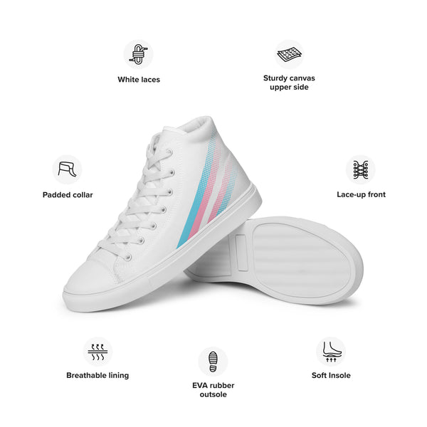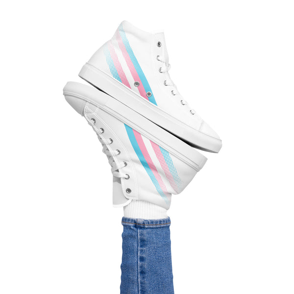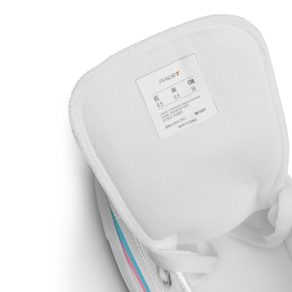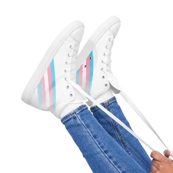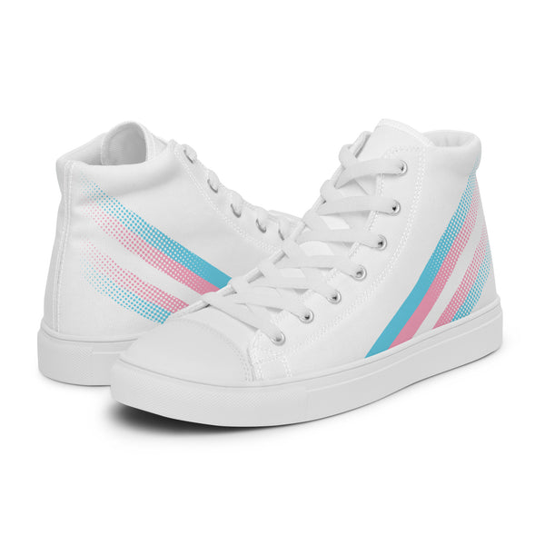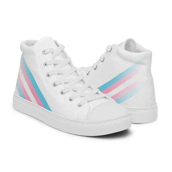 Show your pride with these Trans Flag High Top Shoes. Featuring large diagonal faded transgender pride flags, these white shoes are perfect for making a statement and showing your support. Be bold, be proud, be you.