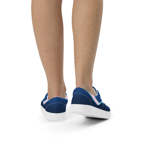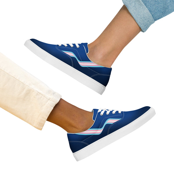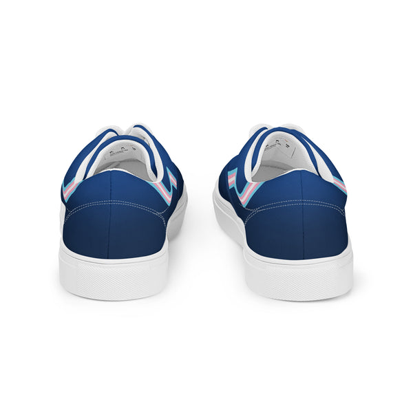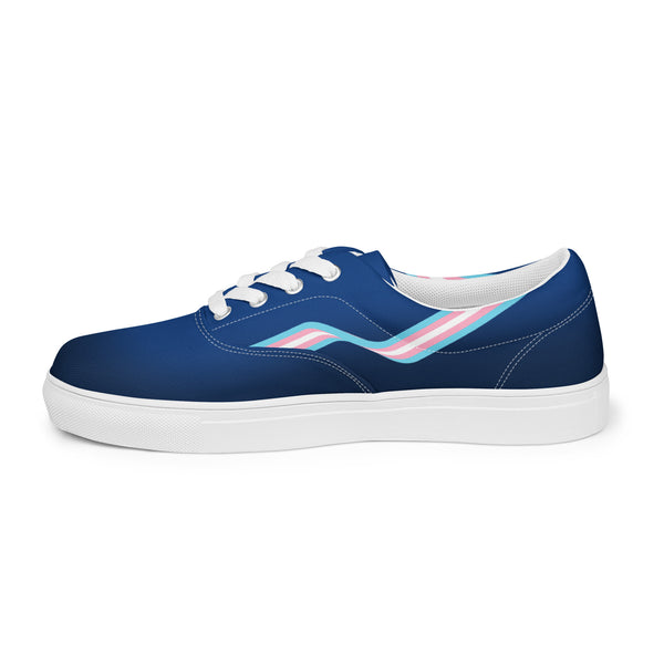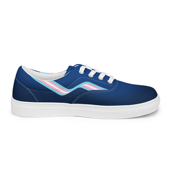 Step out in style and show your pride with our Trans Pride Lace-Up Shoes for women! These blue to dark blue faded shoes feature wavy Transgender pride flags, making a bold and empowering statement. Perfect for everyday wear or to complete your pride parade outfit. Be proud and stand tall!