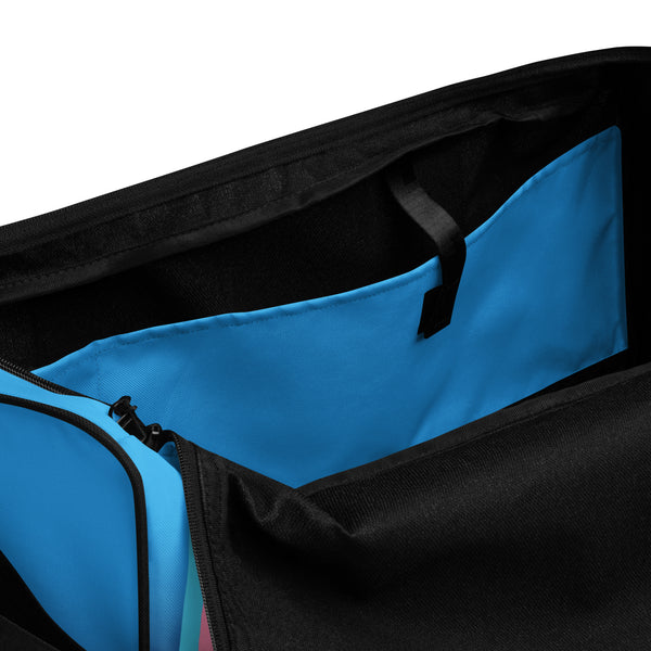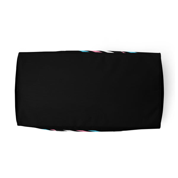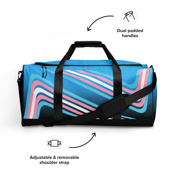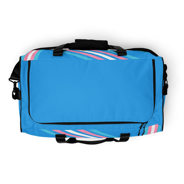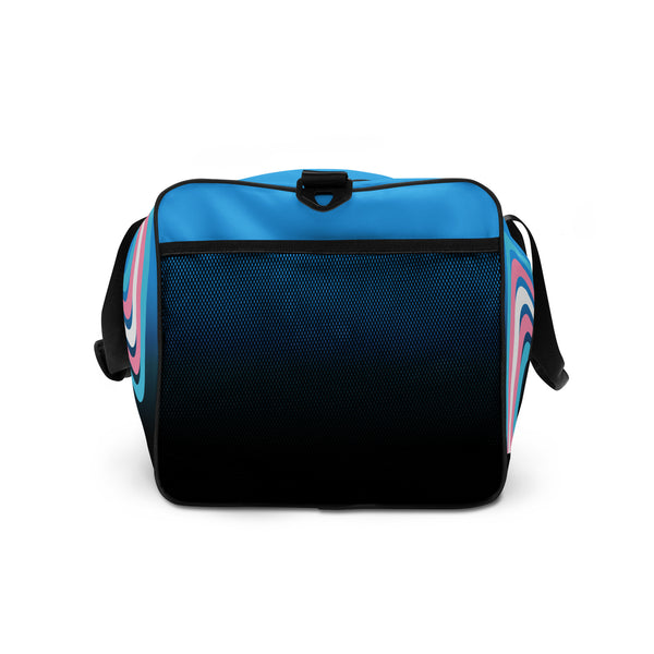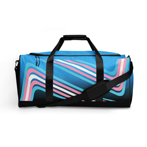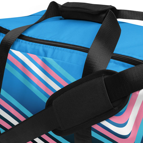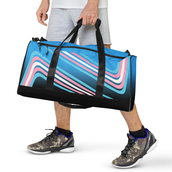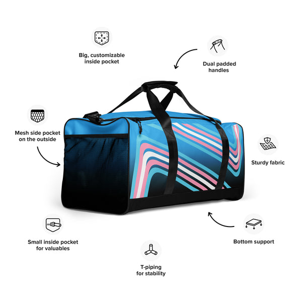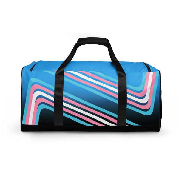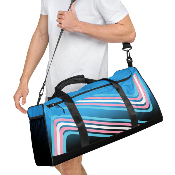 Introducing the Trans Pride Travel Bag, with a captivating blue to black fade and vibrant transgender pride flag colored stripes. Perfect for showing your pride on-the-go, while keeping your belongings organized and secure. Make a statement with this bold and functional accessory.